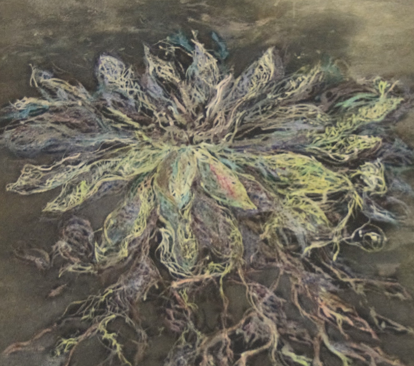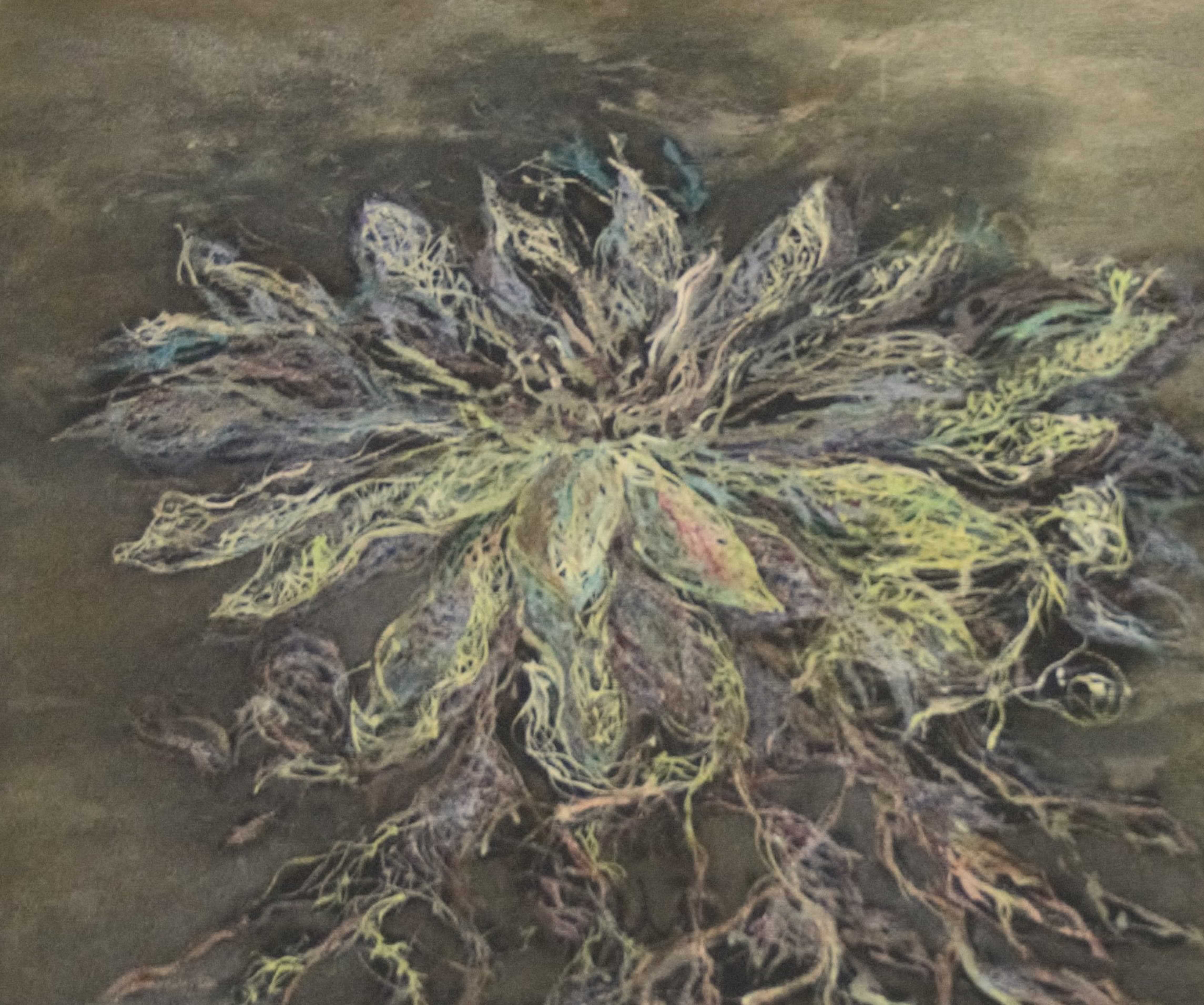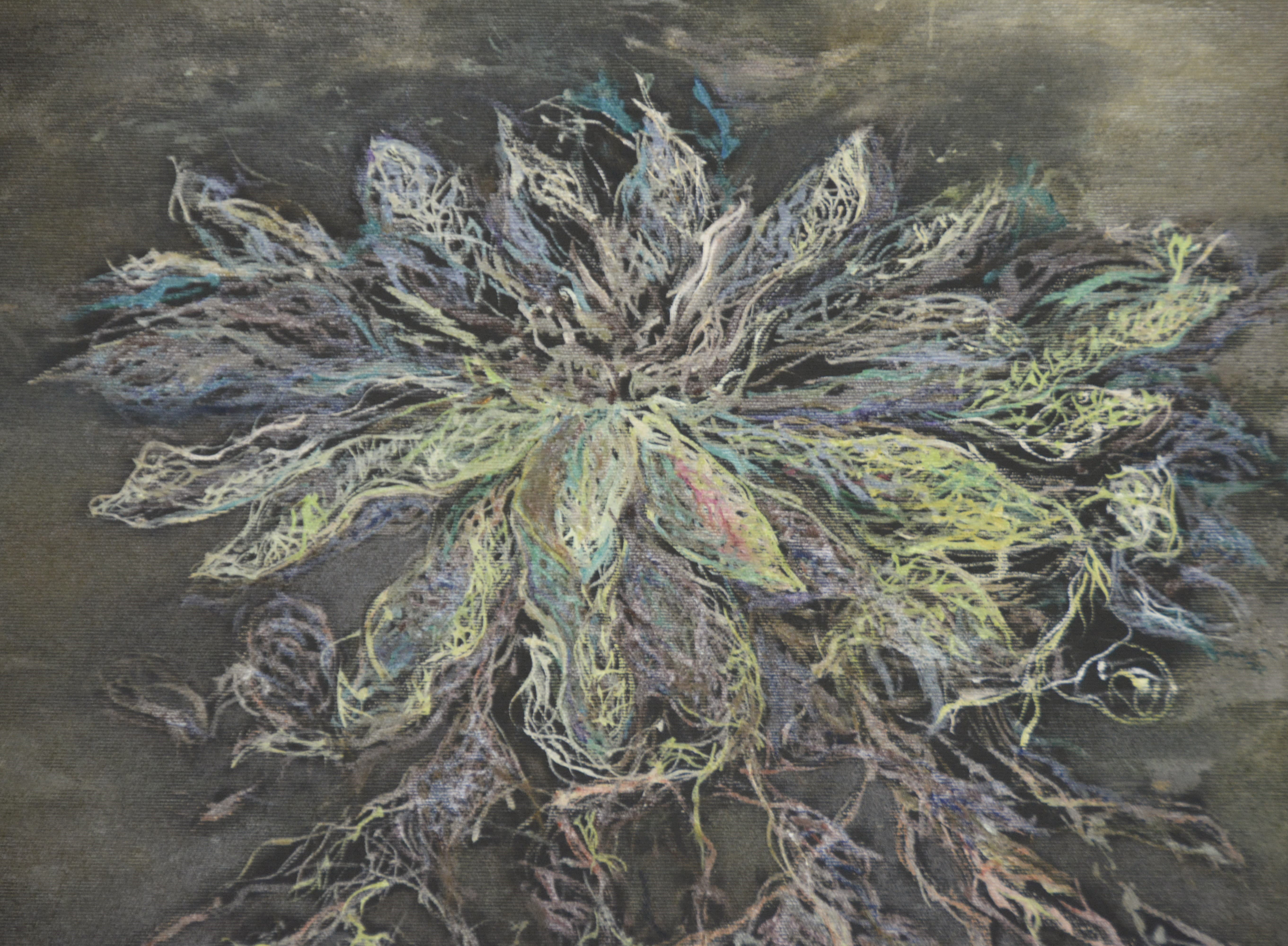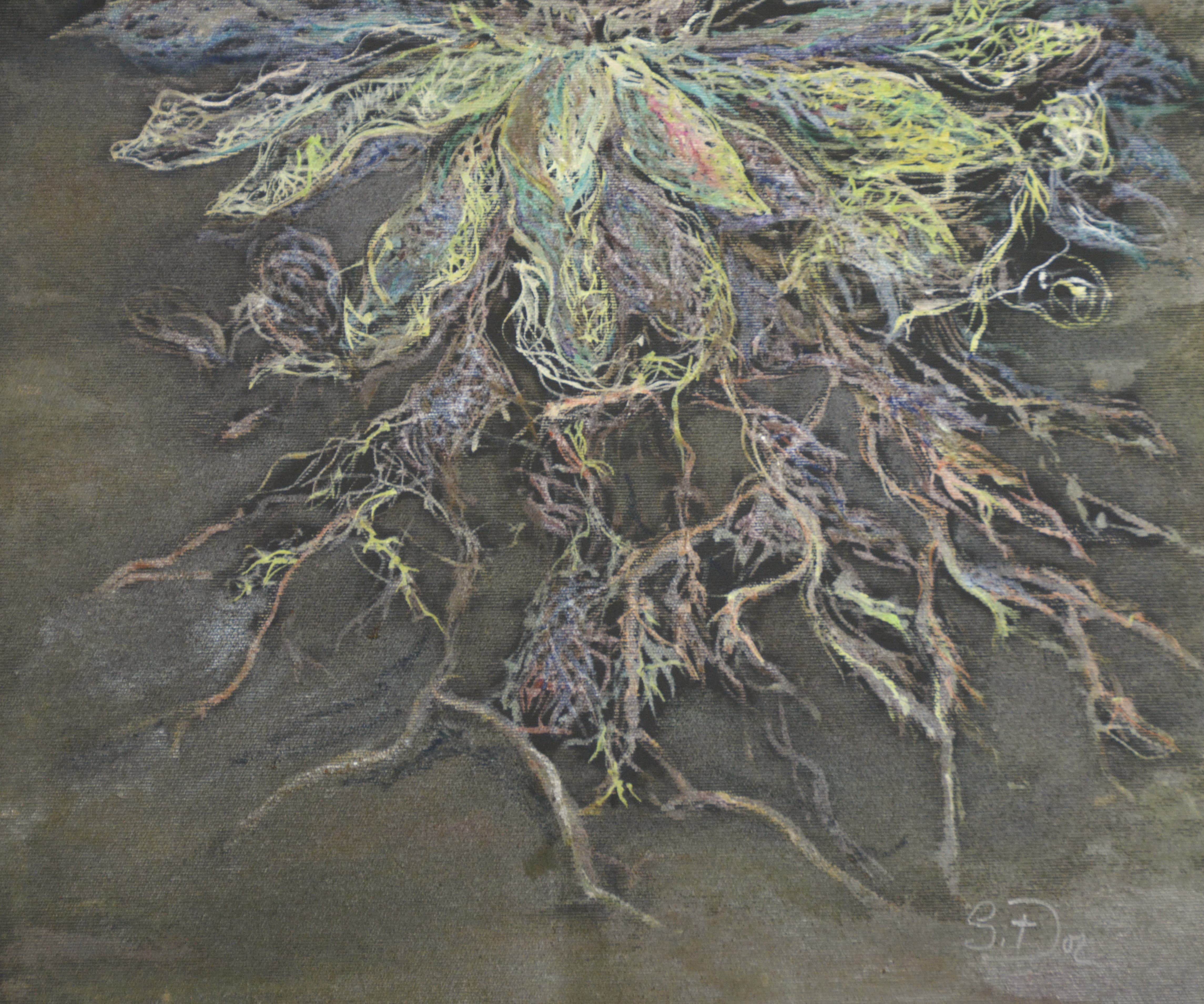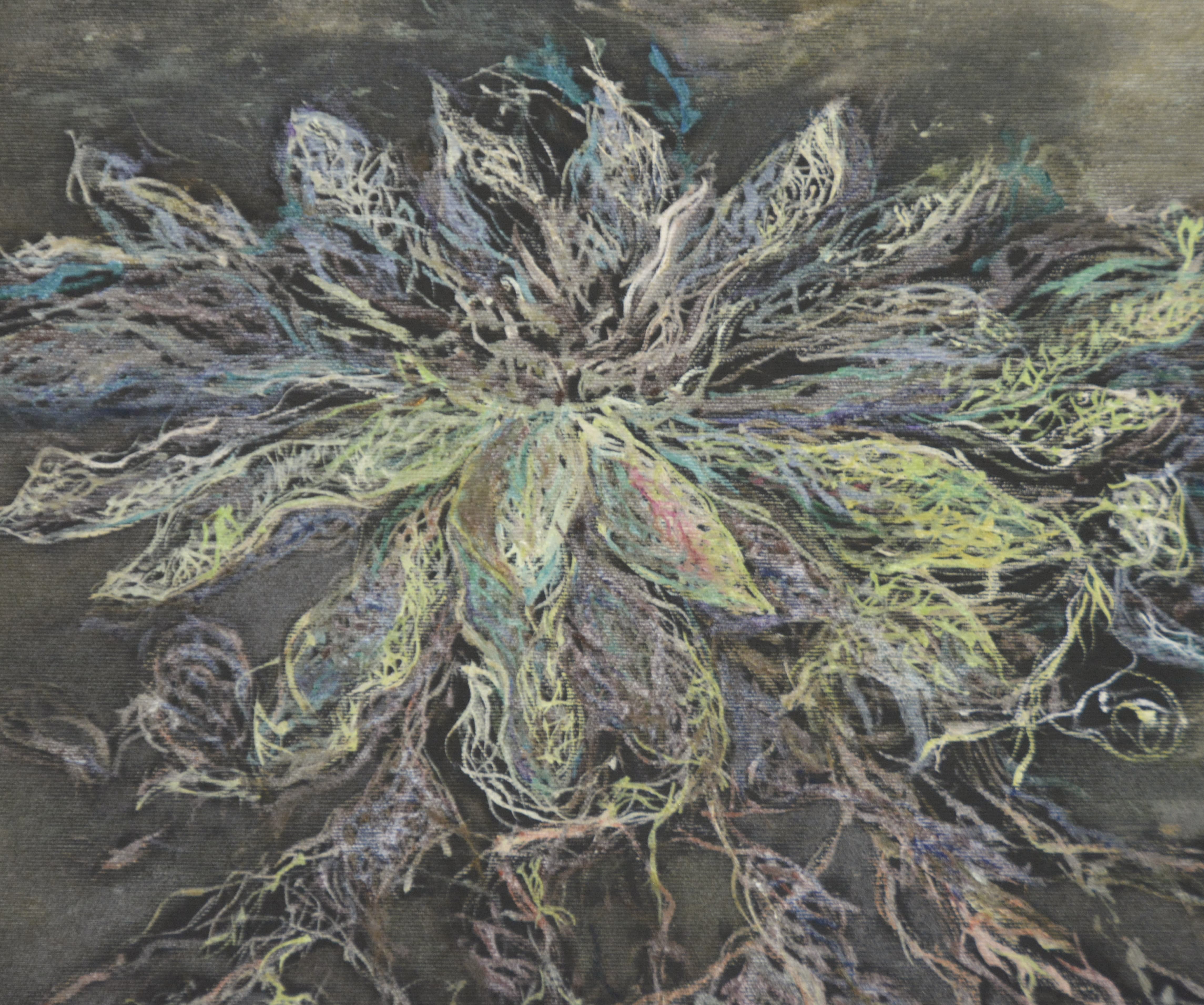 Un tablou enigmatic infatiseaza un nufar care sfideaza legile naturii, pluteste, dar este inradacinat adanc in pamant. Petalele sale sunt impletiri, usor translucide, par sa capteze lumina. Radacinile, extrem de ramificate, se intind sub el ca niste vene puternice, patrunzand adanc in solul intunecat, ca si cum ar absorbi secretele pamantului. Atmosfera tabloului sugereaza un echilibru intre delicatete si forta, intre plutire si ancorare, creand o imagine simbolica a conexiunii dintre visare si realitate.