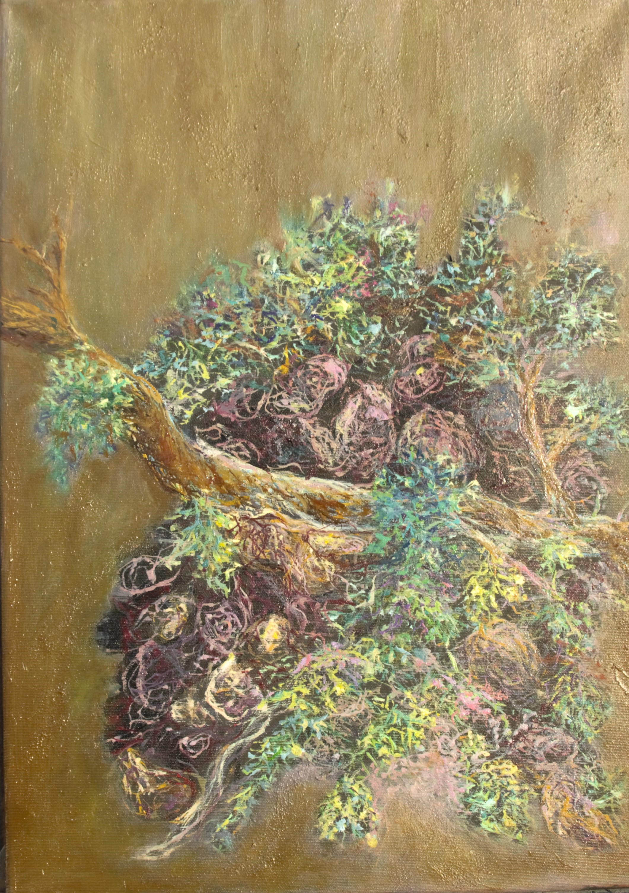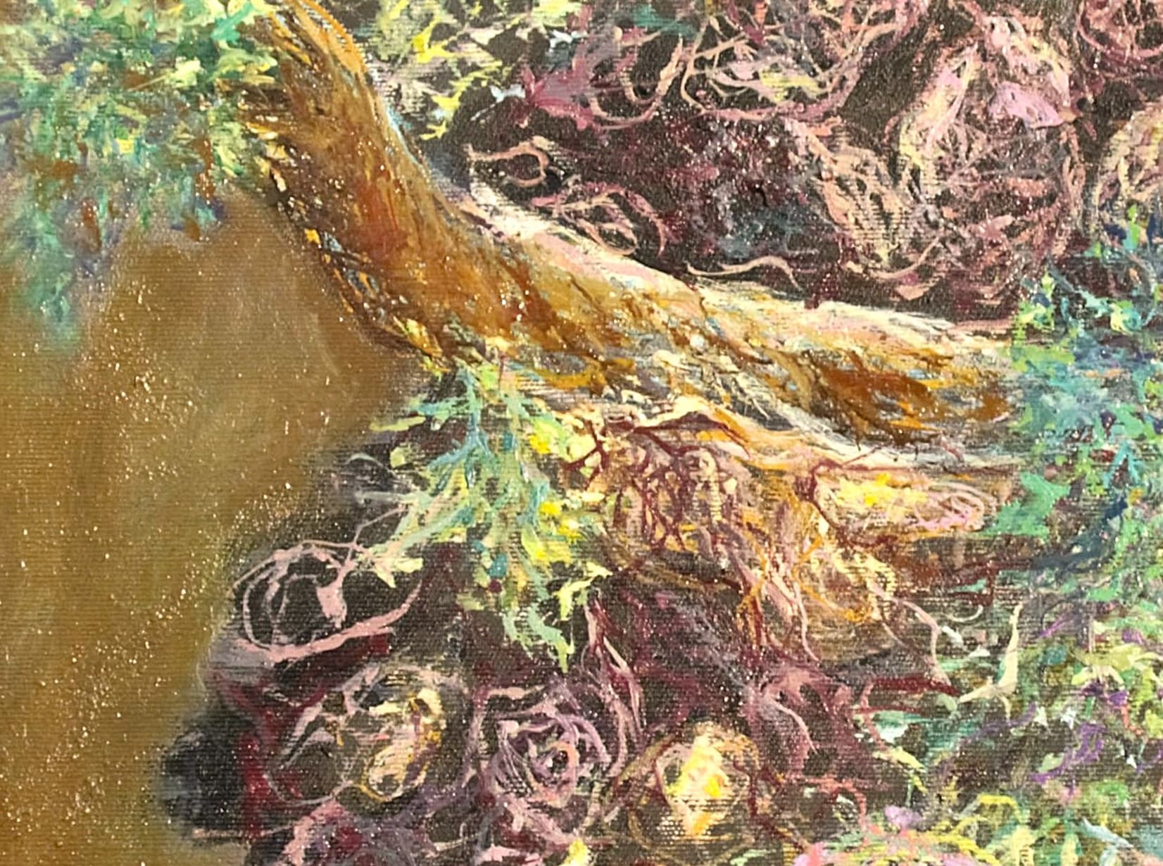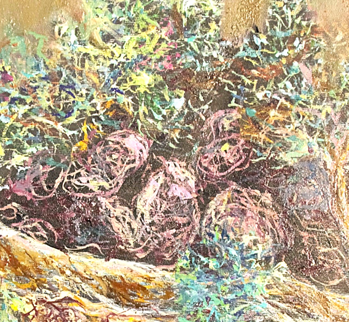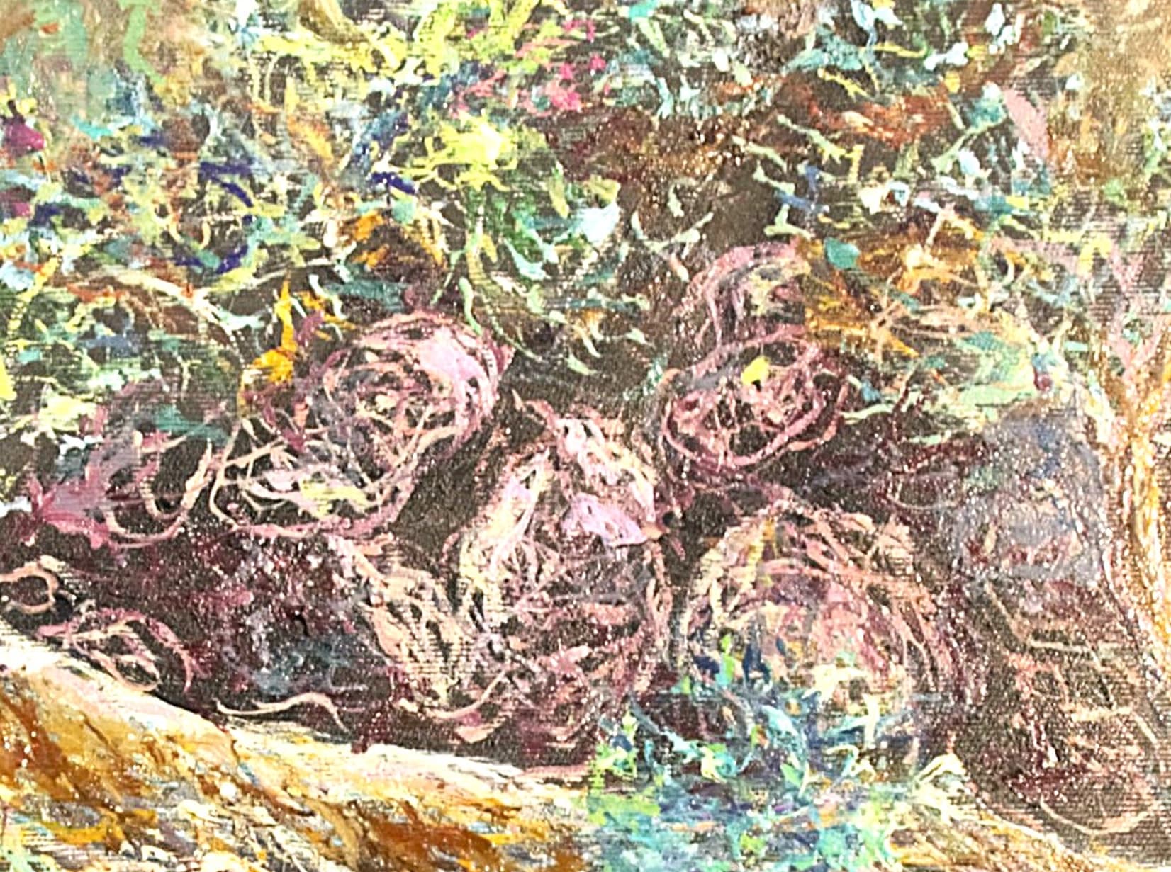 Tabloul Ascuns surprinde o scena misterioasa si linistitoare: o creanga subtire, delicata, cu frunze verzi vibrante, se intinde deasupra unor pietricele, asezate aparent intamplator. Frunzele par sa filtreze lumina, creand umbre fine pe suprafata pietrelor. Sub aceasta compozitie naturala, se ascunde ceva nevazut, un secret bine pastrat de pamant si timp. Poate fi o relicva, o cheie uitata, o comoara a naturii sau doar un simbol al necunoscutului. Tabloul invita privitorul la contemplare si curiozitate, sugerand ca adevarurile cele mai interesante sunt adesea bine ascunse sub detalii simple si aparent obisnuite.