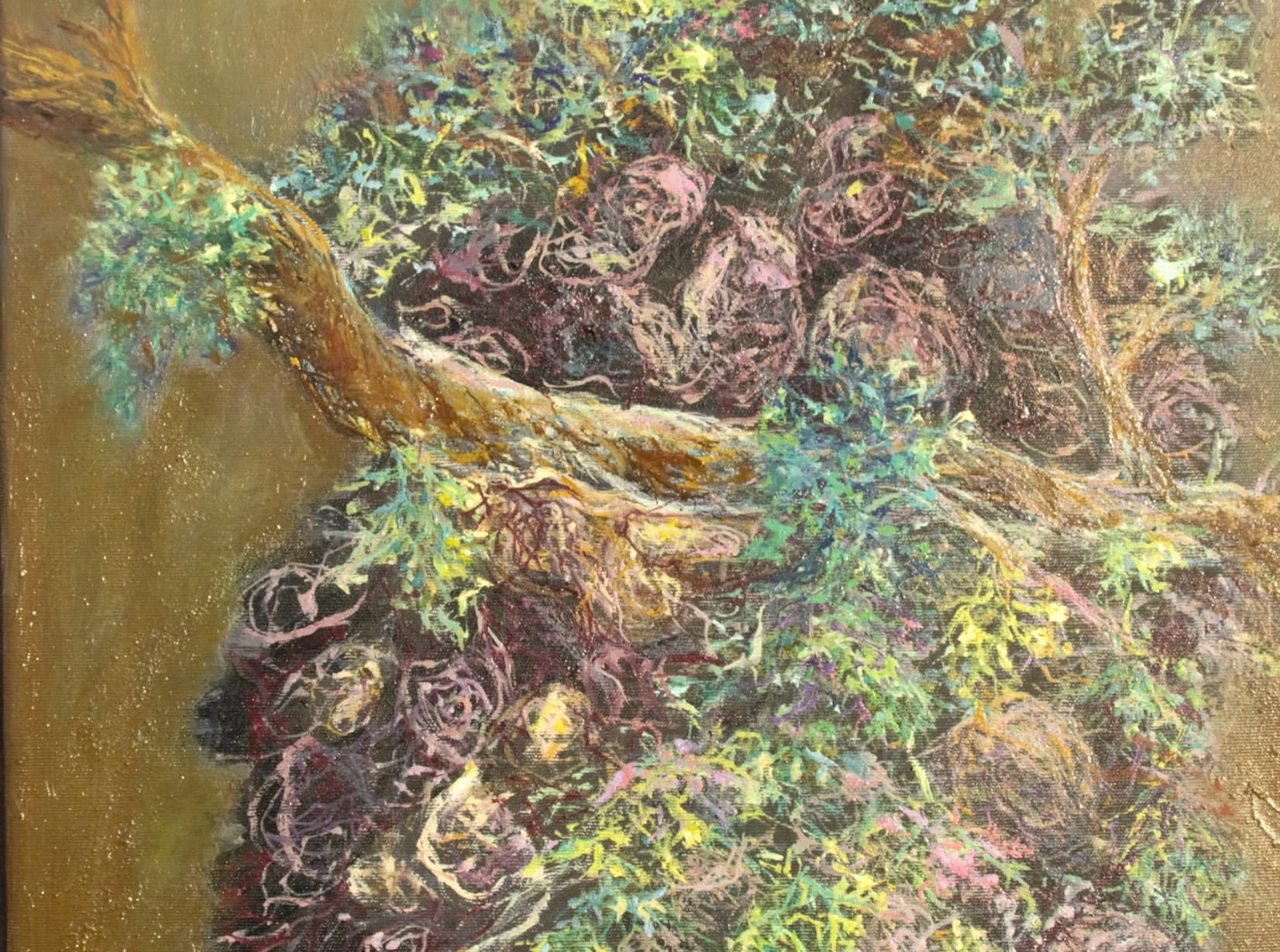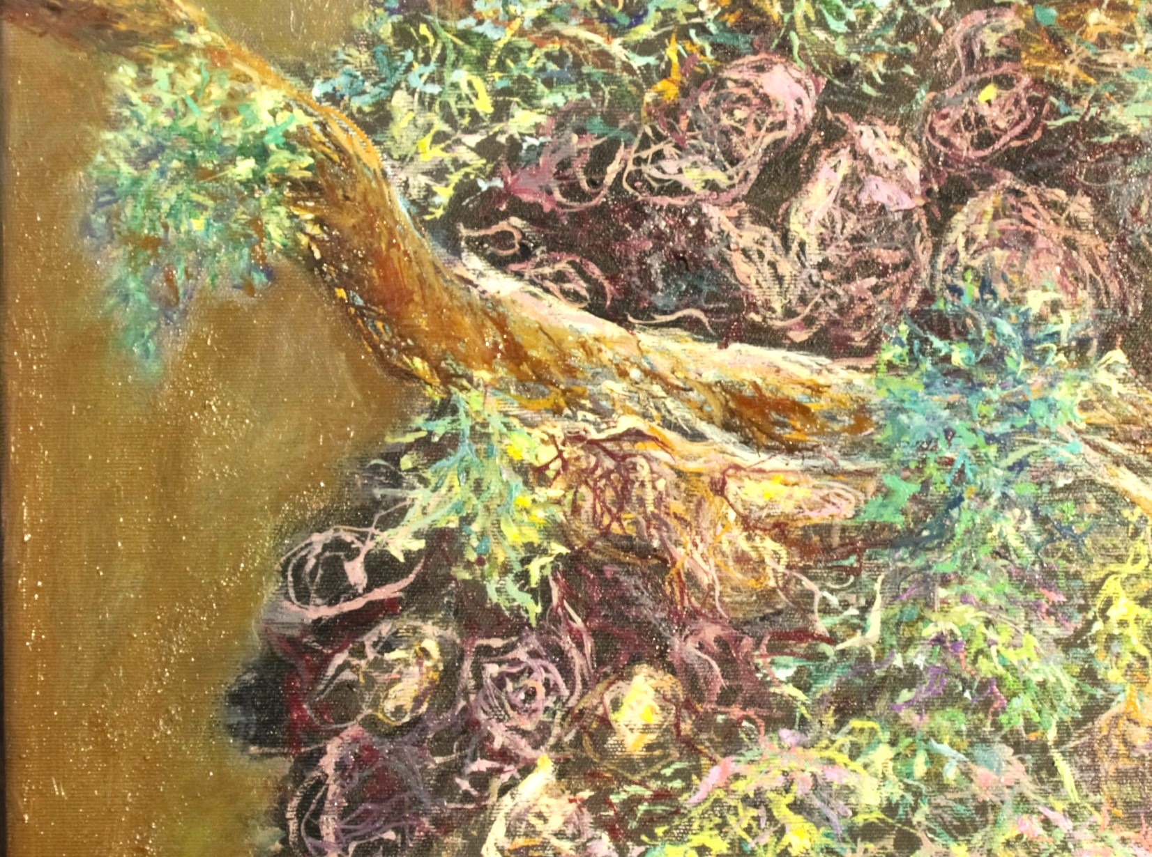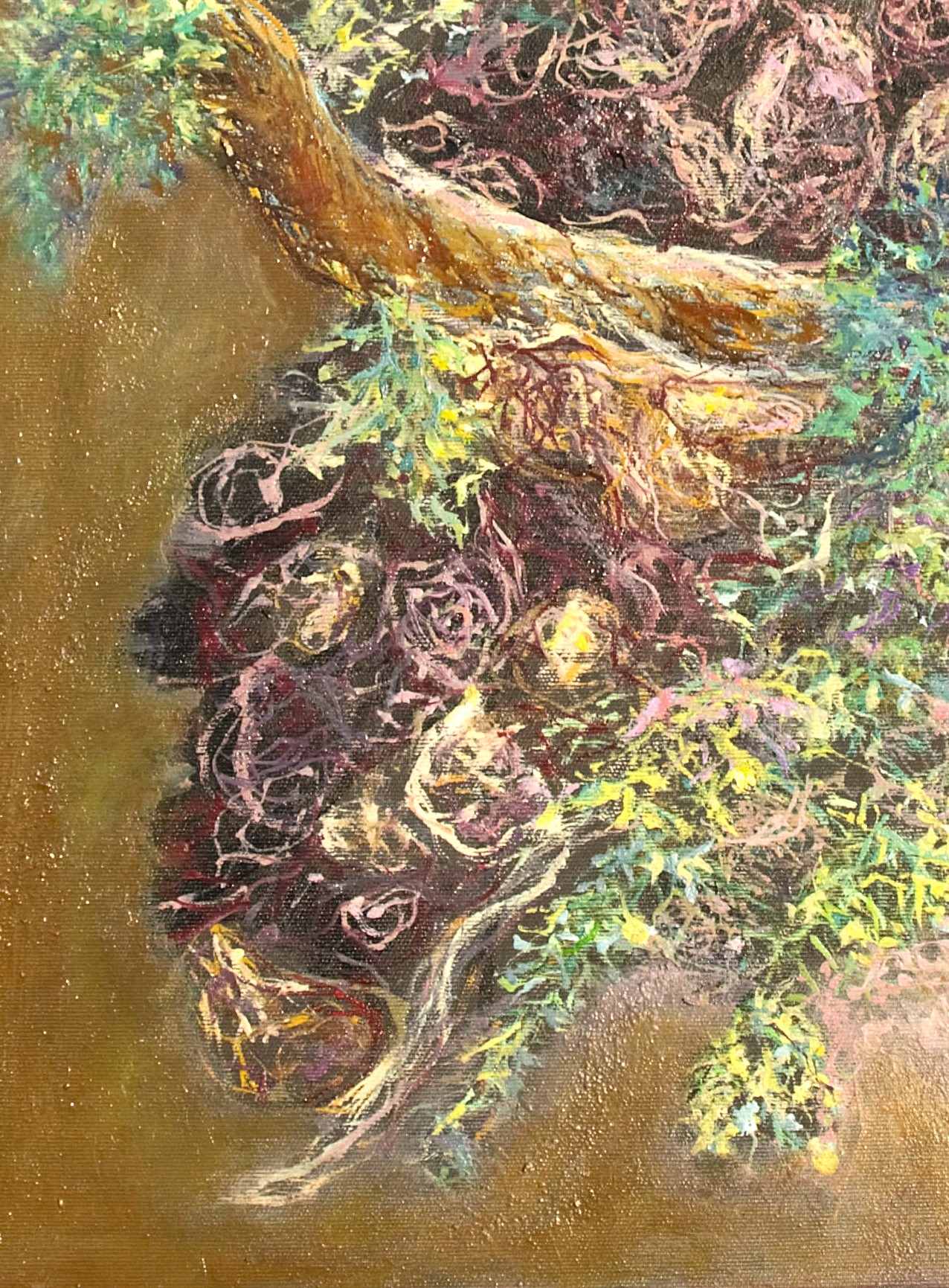 Tabloul Ascuns surprinde o scena misterioasa si linistitoare: o creanga subtire, delicata, cu frunze verzi vibrante, se intinde deasupra unor pietricele, asezate aparent intamplator. Frunzele par sa filtreze lumina, creand umbre fine pe suprafata pietrelor. Sub aceasta compozitie naturala, se ascunde ceva nevazut, un secret bine pastrat de pamant si timp. Poate fi o relicva, o cheie uitata, o comoara a naturii sau doar un simbol al necunoscutului. Tabloul invita privitorul la contemplare si curiozitate, sugerand ca adevarurile cele mai interesante sunt adesea bine ascunse sub detalii simple si aparent obisnuite.