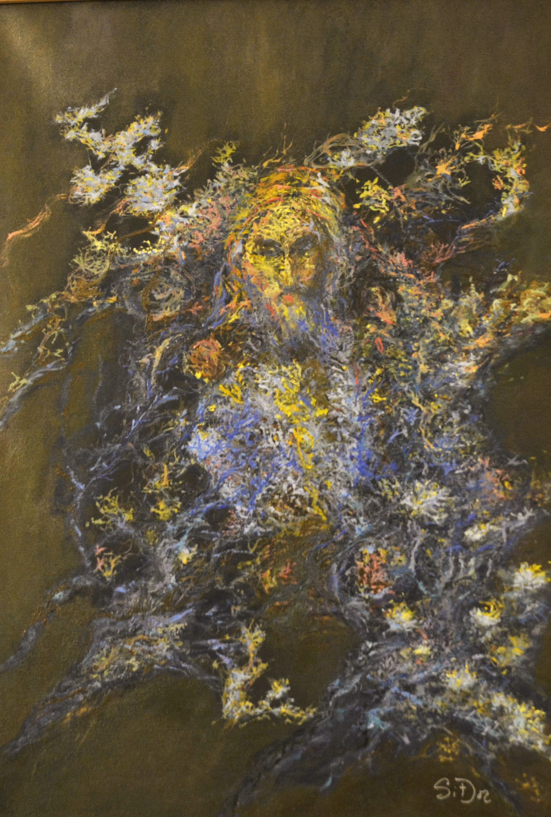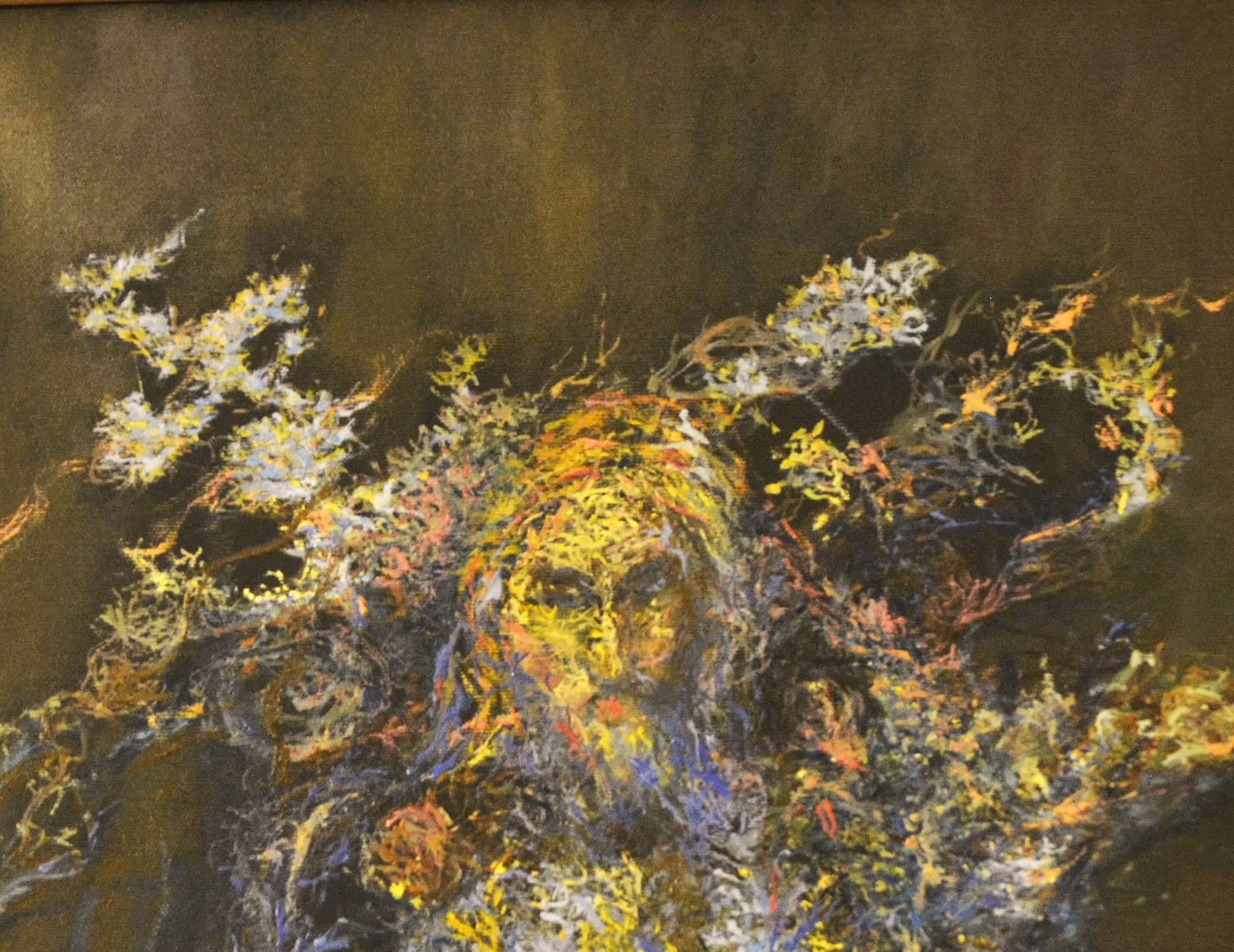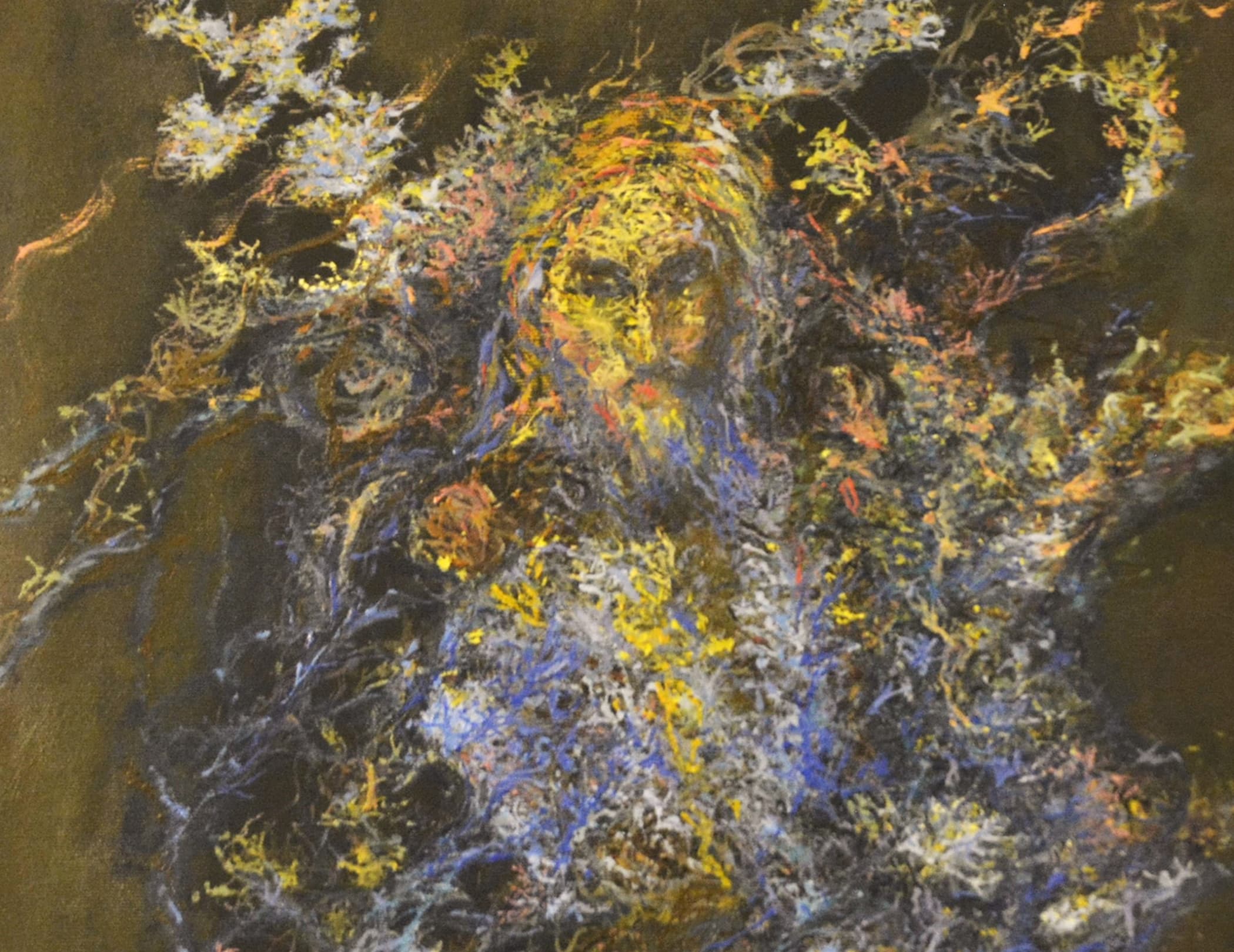 Un chip cristic se conturează încet, ca o revelație tăcută, ascuns în inima unei vegetatii dense și tenebroase. Între rădăcinile încâlcite și lianele ce atârnă ca niște brațe uitate de timp, trăsăturile feței sale se ivesc subtil, sculptate în umbre și lumini filtrate prin frunzișul întunecat. Ochii, adânci ca o taină, par să absoarbă toată suferința lumii, dar și o blândețe infinită, ascunsă în privirea lor tăcută. Fruntea poartă urmele unei înțelepciuni care transcende timpul. Pe alocuri, vegetația se retrage, lăsând să pătrundă firave raze de lumină, ca niște atingeri divine ce mângâie conturul feței, dezvăluindu-i pentru o clipă expresia solemnă. În liniștea stranie a acestui loc, parcă se aude o șoaptă: chemarea unui adevăr ascuns, pe care doar cei care privesc dincolo de imagine o pot auzi.