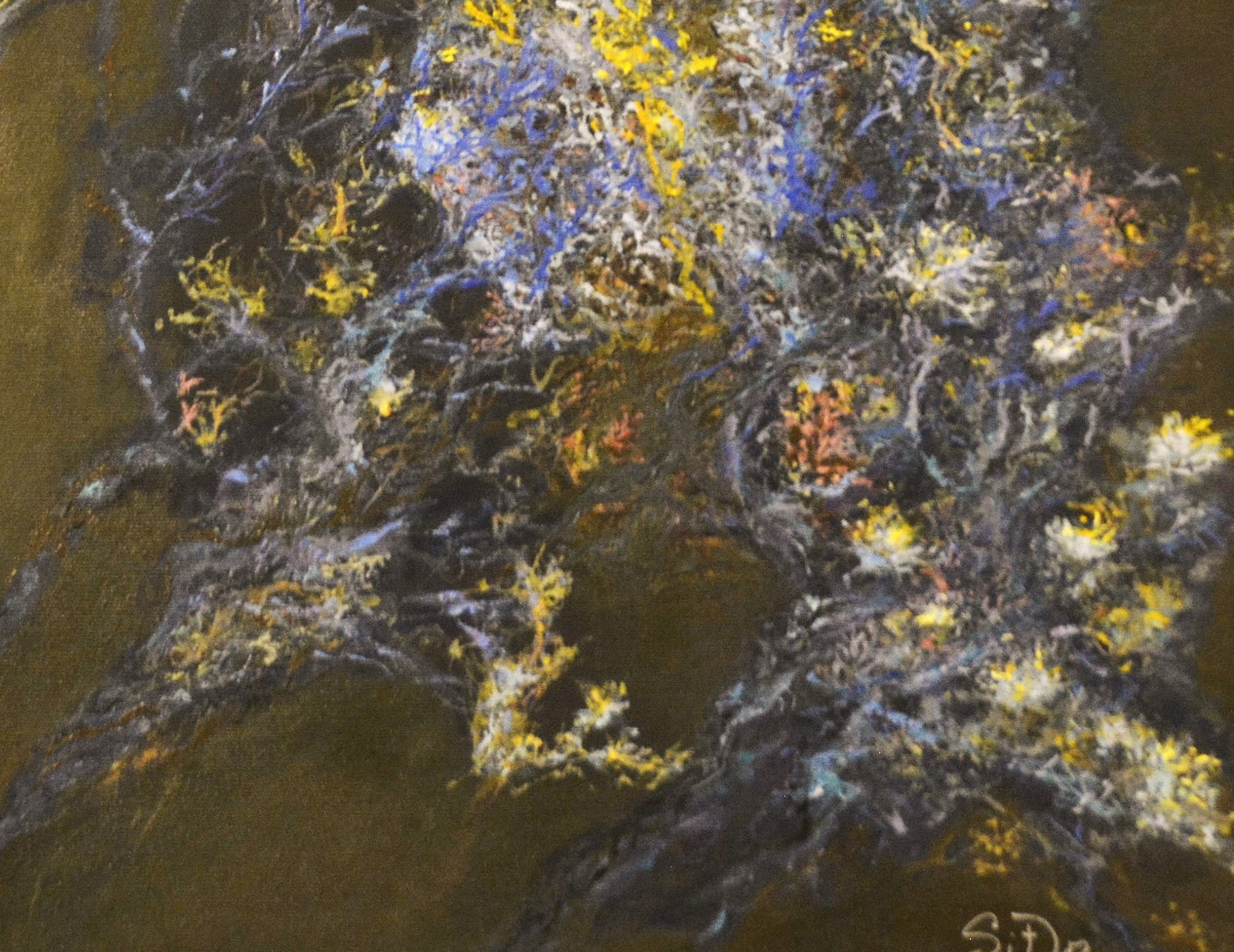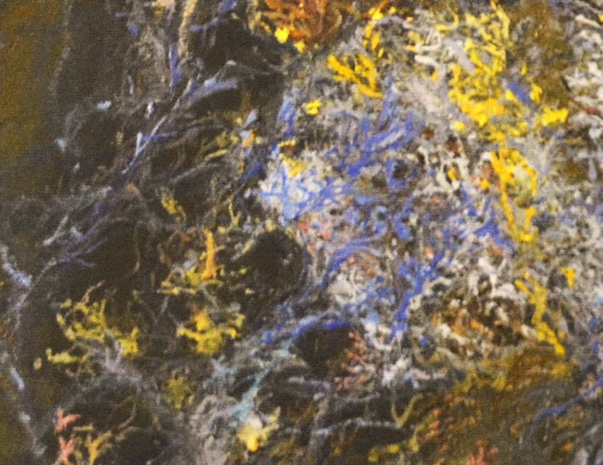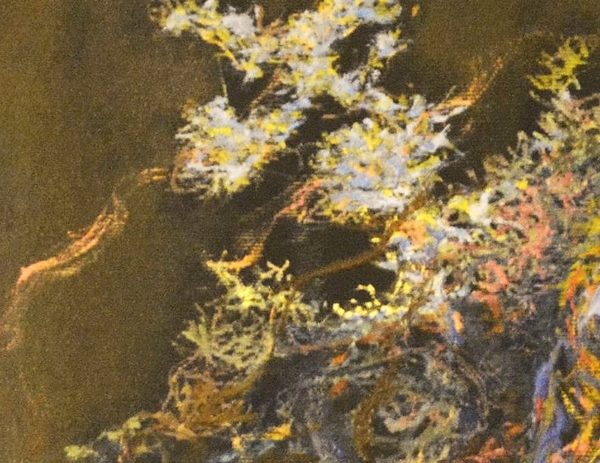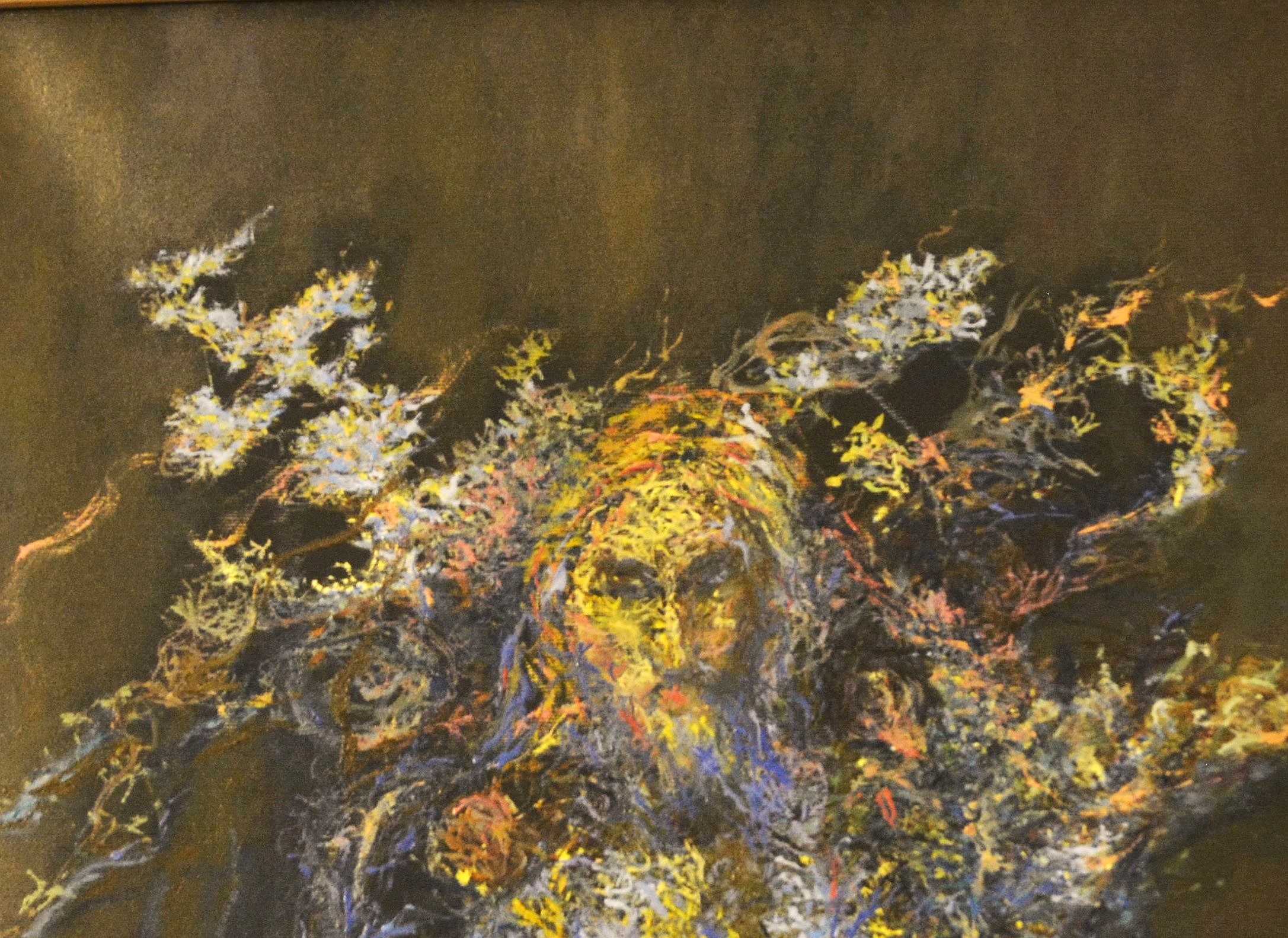 Un chip cristic se conturează încet, ca o revelație tăcută, ascuns în inima unei vegetatii dense și tenebroase. Între rădăcinile încâlcite și lianele ce atârnă ca niște brațe uitate de timp, trăsăturile feței sale se ivesc subtil, sculptate în umbre și lumini filtrate prin frunzișul întunecat. Ochii, adânci ca o taină, par să absoarbă toată suferința lumii, dar și o blândețe infinită, ascunsă în privirea lor tăcută. Fruntea poartă urmele unei înțelepciuni care transcende timpul. Pe alocuri, vegetația se retrage, lăsând să pătrundă firave raze de lumină, ca niște atingeri divine ce mângâie conturul feței, dezvăluindu-i pentru o clipă expresia solemnă. În liniștea stranie a acestui loc, parcă se aude o șoaptă: chemarea unui adevăr ascuns, pe care doar cei care privesc dincolo de imagine o pot auzi.